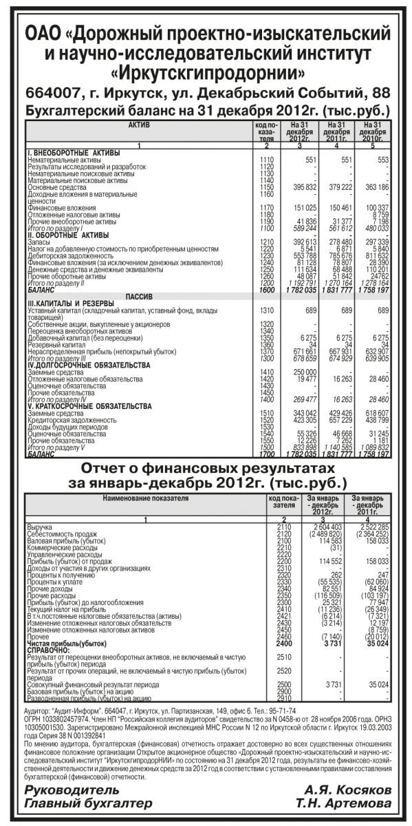 Годовая бухгалтерская отчетность ОАО «Дорожный проектно-изыскательский и научно-исследовательский институт «Иркутскгипродорнии» за 2012 год