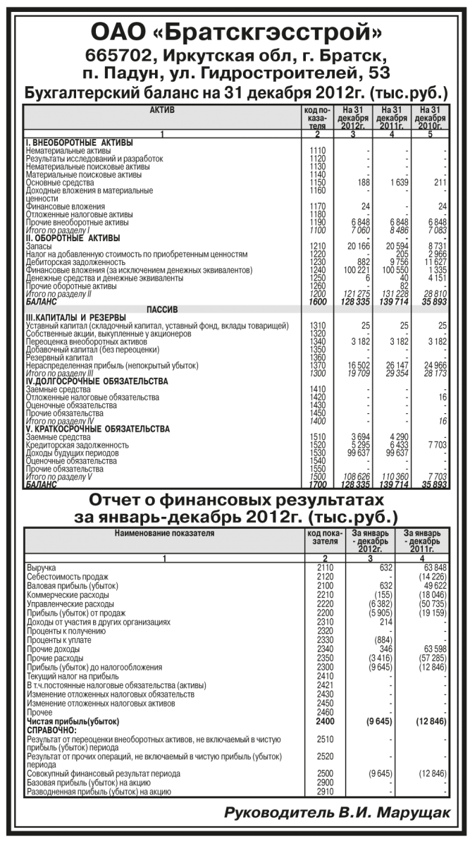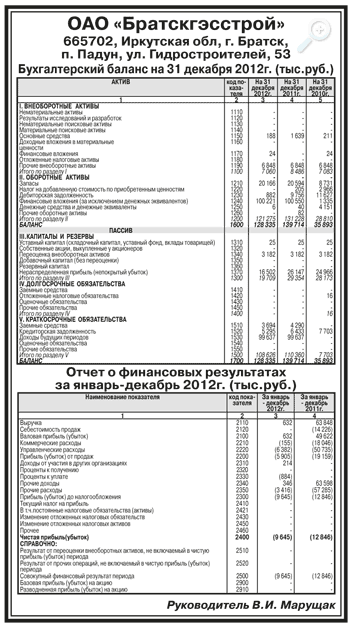 Годовая бухгалтерская отчетность ОАО «Братскгэсстрой» за 2012 год