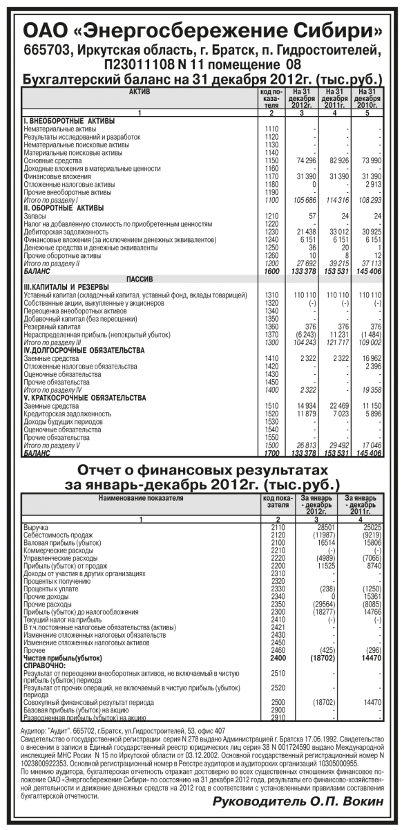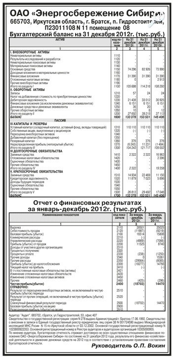 Годовая бухгалтерская отчетность ОАО «Энергосбережение Сибири» за 2012 год