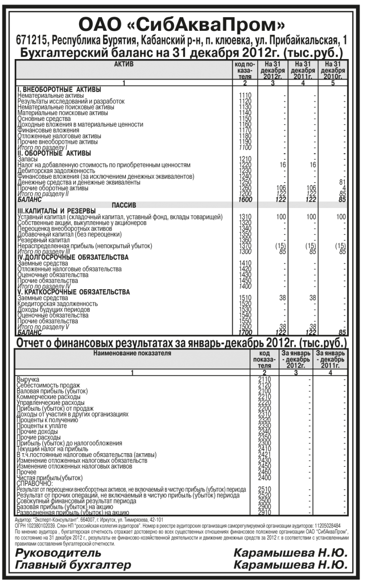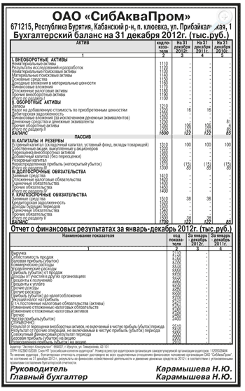 Годовая бухгалтерская отчетность ОАО «СибАкваПром» за 2012 год