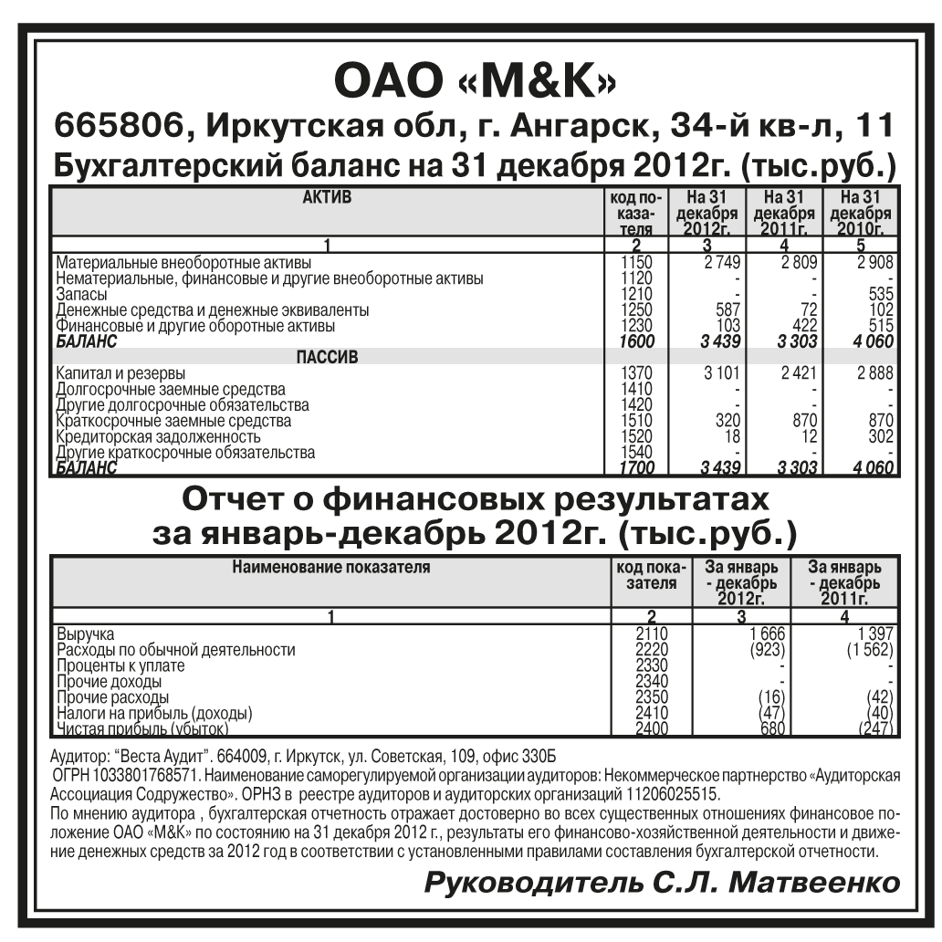 Годовая бухгалтерская отчетность ОАО «М&К» за 2012 год