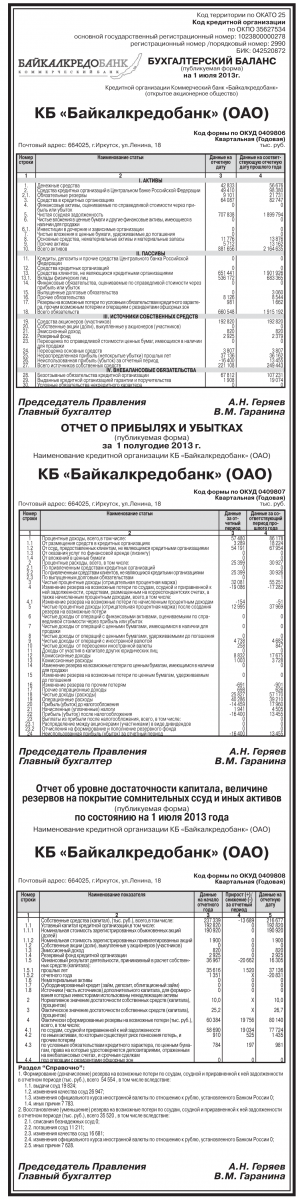 Бухгалтерский баланс ОАО КБ "Байкалкредобанк" на 1 июля 2013 года