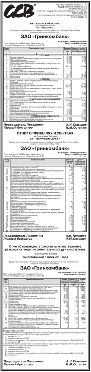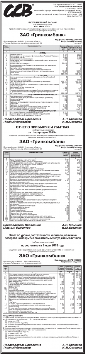Бухгалтерский баланс ЗАО "Гринкомбанк" на 1 июля 2013 года