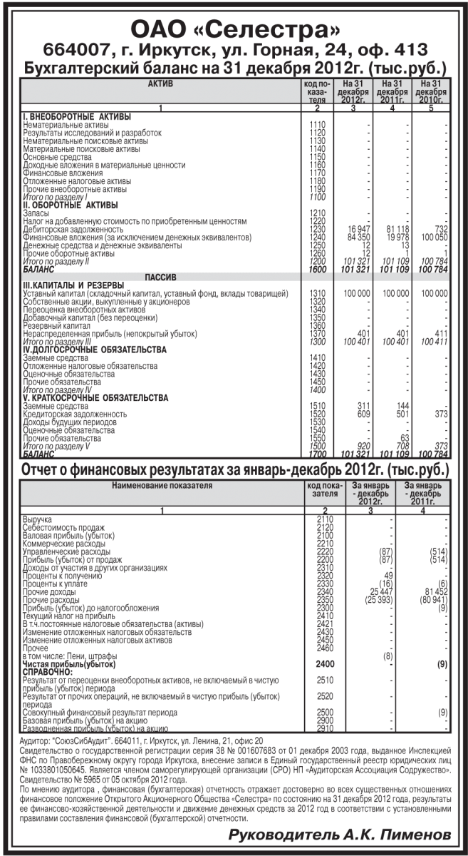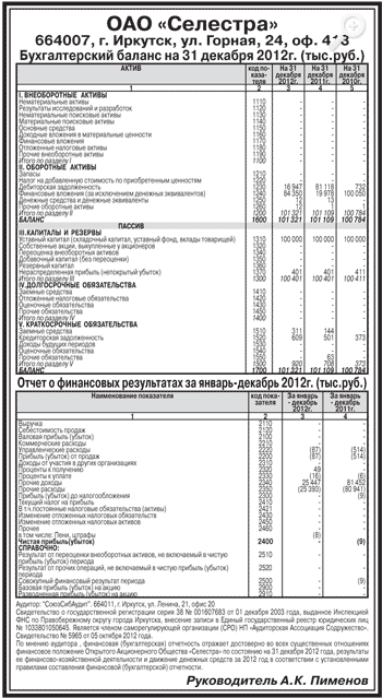 Бухгалтерская отчетность ОАО «Селестра» за 2012 год