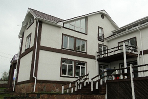 Дом рассчитан на небольшую семью. 3 спальни, гостиная, камин, 2 санузла, хоз. помещения, зимний сад. Площадь участка 40 соток. На территории участка расположены бассейн, сауна, гостевой дом, домик для персонала, гараж, домик для охраны, беседка, постройки хоз.назначения, имеется подвал.