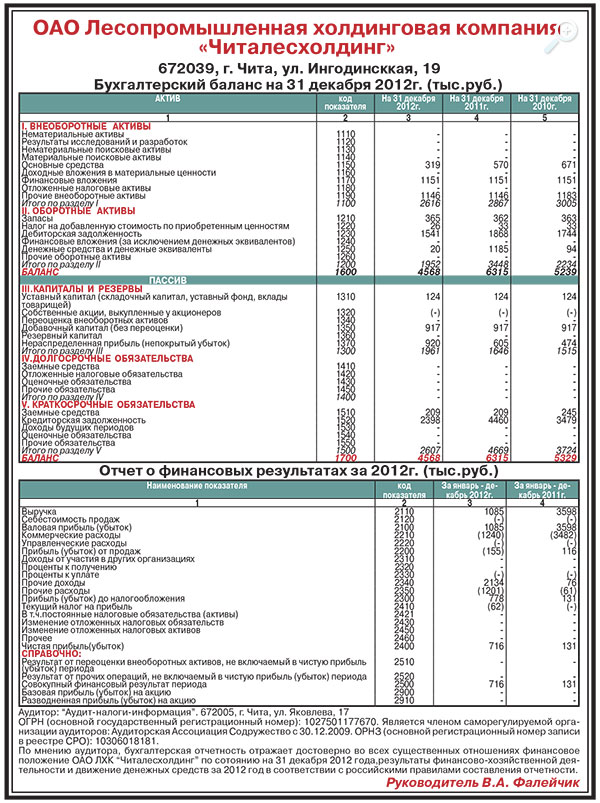 ОАО Лесопромышленная холдинговая компания «Читалесхолдинг» Бухгалтерский баланс на 31 декабря 2012г. (тыс.руб.)