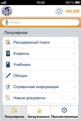 Программа работает в двух режимах: онлайн и оффлайн. Для работы без выхода в Интернет (в режиме оффлайн) нужно заранее сохранить в «Загруженные документы» до 100 документов, в том числе учебников. В режиме онлайн можно работать с полной базой документов приложения. Все документы регулярно обновляются. Приложение «КонсультантПлюс: Студент» доступно в магазинах приложений App Store (для iPhone/iPad – https://itunes.apple.com/ru/app/konsul-tantplus-student/id571689619?mt=8) и Google Play (для Android-устройств – https://play.google.com/store/apps/details?id=com.consultantplus.hs) в категории «Образование». Подробнее о приложении – www.consultant.ru/student.