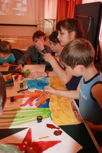 Очередной мастер-класс состоялся накануне, 6 ноября в детском санаторном доме №2 в предместье Рабочее г. Иркутска. Мероприятие посвятили подводному миру: ребятам сначала рассказали об обитателях морей и океанов, показав небольшой диафильм. А затем вместе с художниками они рисовали рыб и морских звезд, которых разместили на фоне подводных пейзажей.