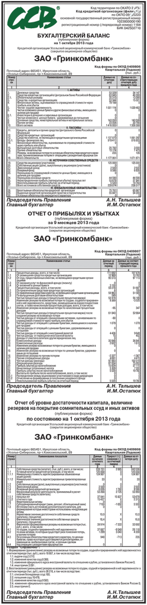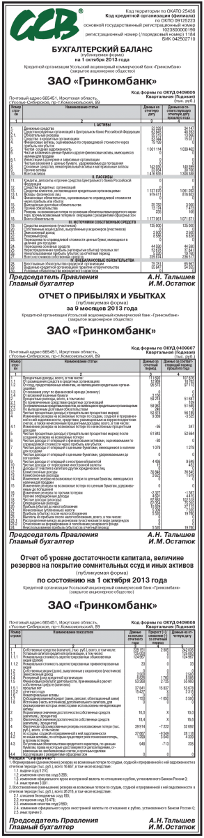Бухгалтерский баланс ЗАО «Гринкомбанк» на 1 октября 2013 года