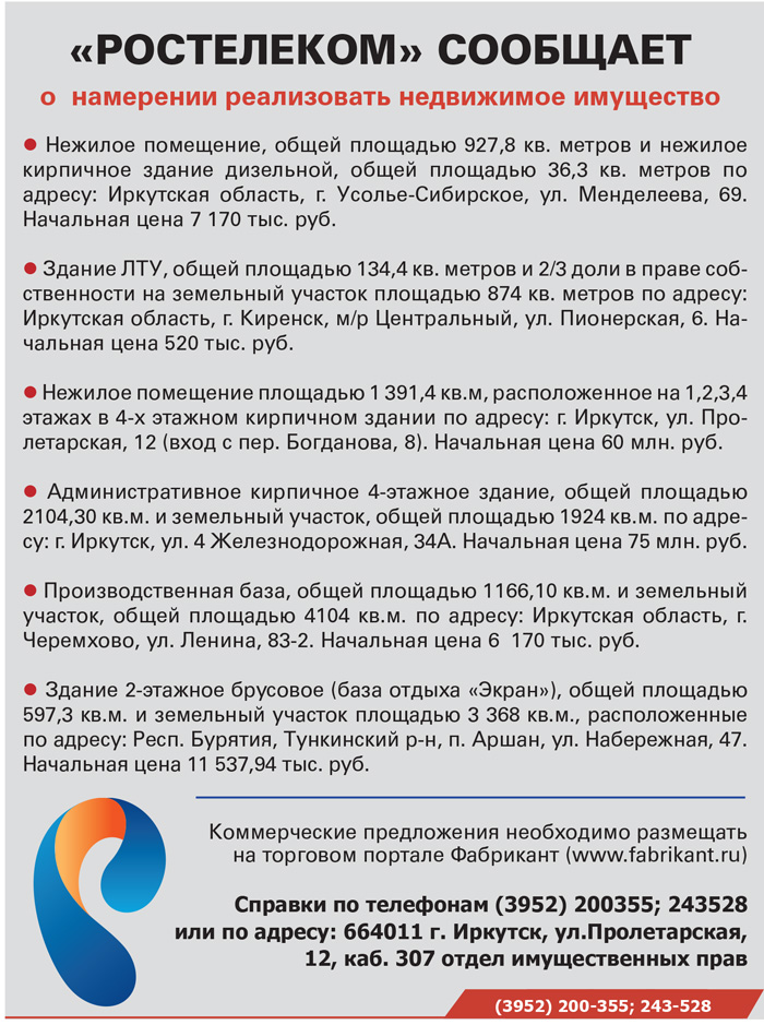 «РОСТЕЛЕКОМ» сообщает о намерении реализовать недвижимость в Иркутске,Черемхово, Усолье-Сибирское и Киренске