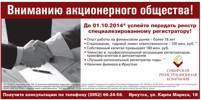 Сибирская Регистрационная Компания: До 1 октября 2014 года успейте передать реестр специализированному регистратору
