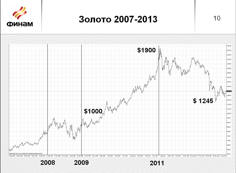 На историческом графике с 2007 года у золота была определена нами своя справедливая стоимость – тысяча долларов за унцию. Почему именно тысяча? Потому что инвесторы два раза оценили золото именно на этом уровне на кризисе 2008 года. Оно достаточно долго здесь стояло.