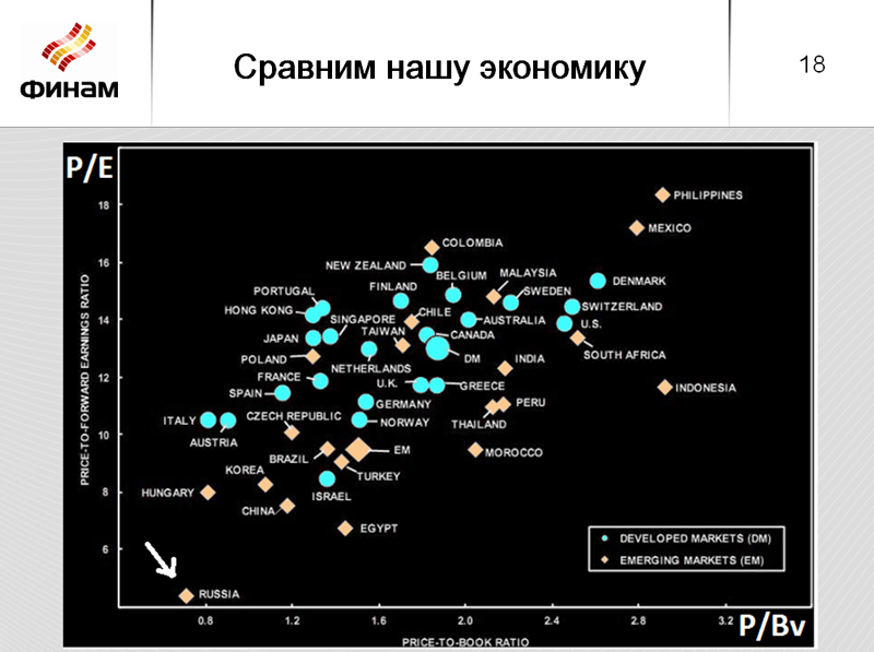 Часто сравниваем нашу экономику и американскую, европейскую как две шоколадки, «Аленка» и «Сникерс». Вот вы зашли в магазин, лежит «Сникерс» – 60 рублей за 30 граммов и лежит «Аленка» – 40 рублей за 100 граммов. Пускай «Сникерс» брендовый, модный, вкусный, но и «Аленка» не хуже. Грамотный инвестор не поддастся эмоциям, выберет «Аленку»: она в три раза тяжелее.