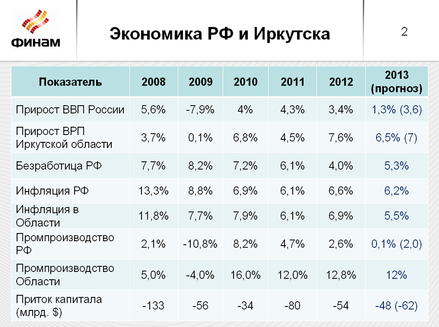 В начале 2013 года прирост российского ВВП прогнозировался на уровне 3,6%, в конце ноября он был скорректирован больше чем в два раза, до 1,3%. По иркутскому валовому региональному продукту цифры гораздо лучше, превышают общероссийские: в начале года этот показатель прогнозировался на уровне 7%, затем был скорректирован до 6,5%. В целом, экономика в Приангарье растет лучше, чем в других регионах.
