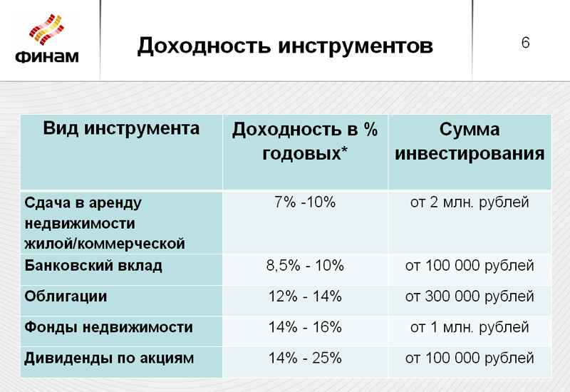 Первое – недвижимость: сдача в аренду жилой и коммерческой недвижимости или покупка-продажа. В среднем можно было получить 7-10% в этом году. Доходность эта снижается по мере роста стоимости недвижимости.