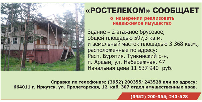 «Ростелеком» сообщает о намерении реализовать недвижимое имущество в Респ. Бурятия, Тункинский р-н, п. Аршан