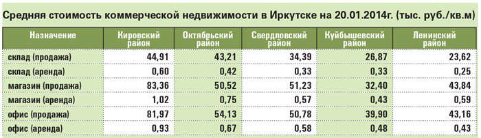 Средняя стоимость коммерческой недвижимости в Иркутске на 20.01.2014г. (тыс. руб./кв.м)