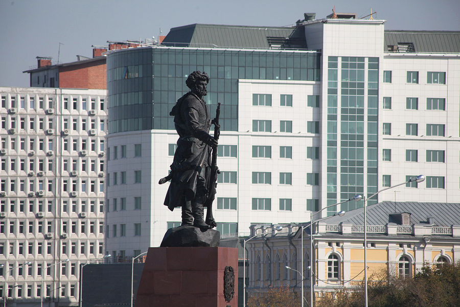 Шестиметровый бронзовый памятник казакам-первопроходцам поставлен к 350-летию Иркутска. Образ первопроходца – собирательный, однако многие ассоциируют его с Яковым Похабовым, который в 1661 году поставил на правом берегу Ангары против устья Иркута острог. Памятник первопроходцам – второй по размеру в Иркутске (на первом месте памятник Александру III).