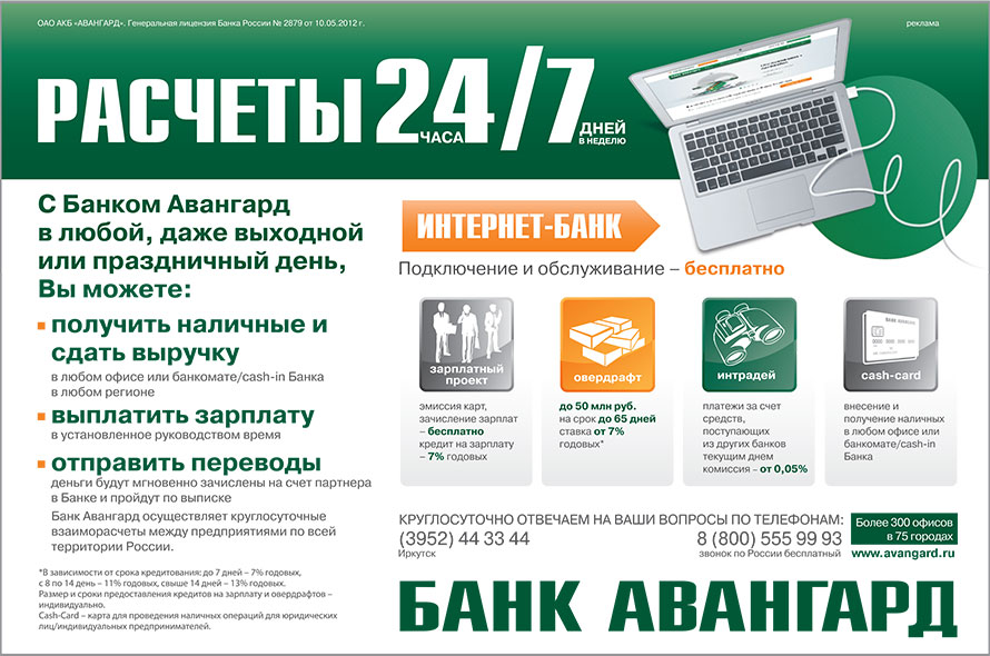 ОАО АКБ «АВАНГАРД». Расчеты 24 часа / 7 дней в неделю