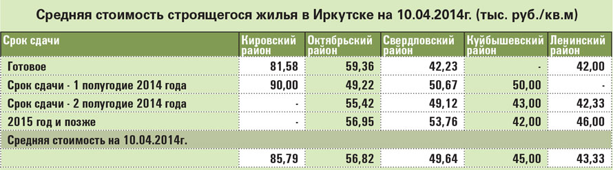 Средняя стоимость строящегося жилья в Иркутске на 10.04.2014г. (тыс. руб./кв.м) По данным REALTY.IRK.RU