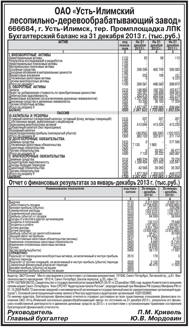 ОАО «Усть-Илимский лесопильно-деревообрабатывающий завод». Бухгалтерский баланс на 31 декабря 2013г. (тыс.руб.)