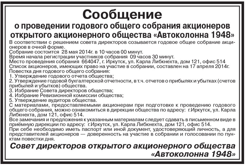 Сообщение о проведении годового общего собрания акционеров открытого акционерного общества «Автоколонна 1948»