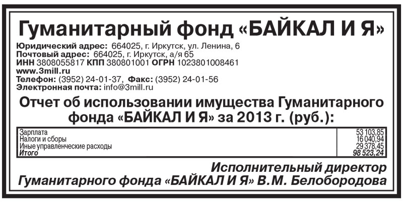 Отчет об использовании имущества Гуманитарного фонда «БАЙКАЛ И Я» за 2013г. (руб.)