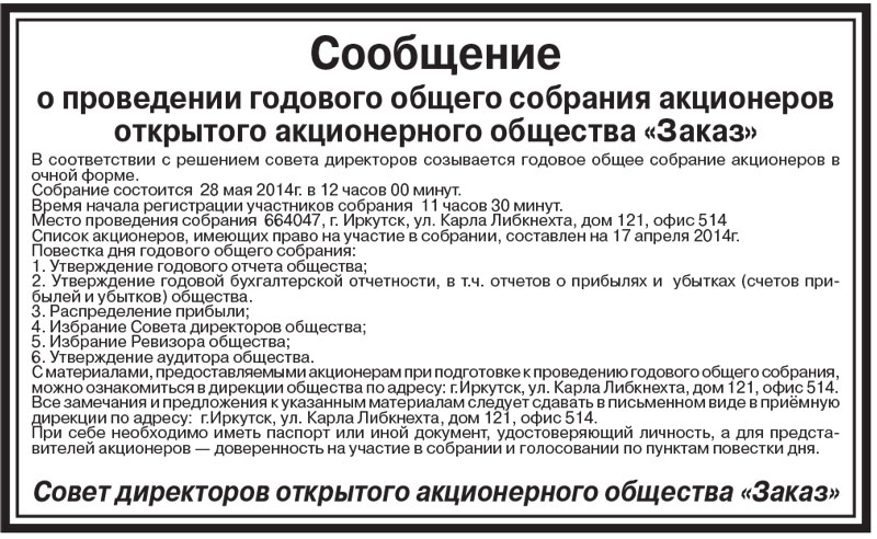 Сообщение о проведении годового общего собрания акционеров открытого акционерного общества «Заказ»