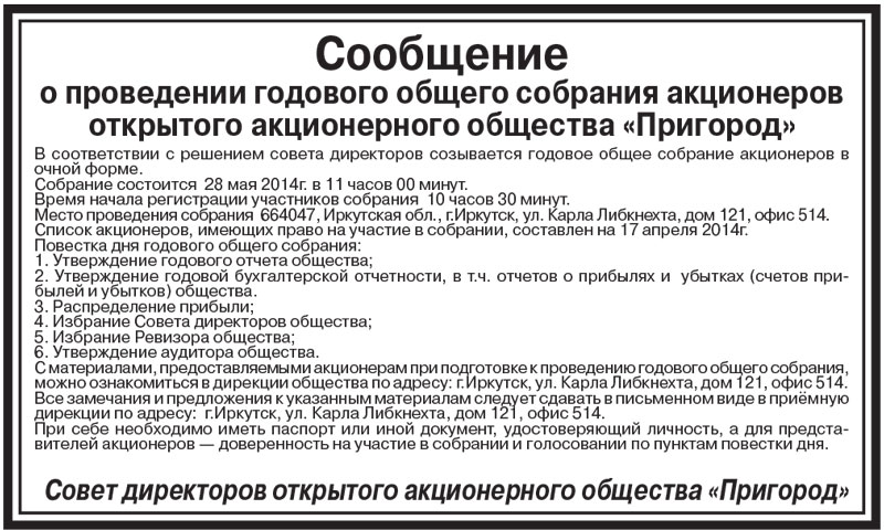Сообщение о проведении годового общего собрания акционеров открытого акционерного общества «Пригород»