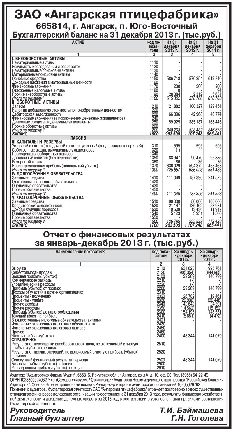 ЗАО «Ангарская птицефабрика». Бухгалтерский баланс на 31 декабря 2013г. (тыс.руб.)