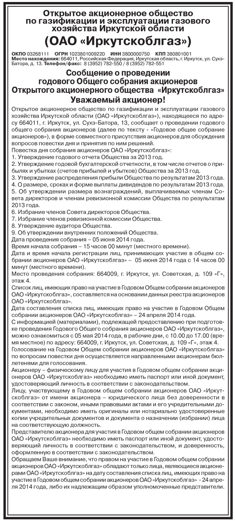 Открытое акционерное общество по газификации и эксплуатации газового хозяйства Иркутской области. Сообщение о проведении годового Общего собрания акционеров Открытого акционерного общества «Иркутскоблгаз»