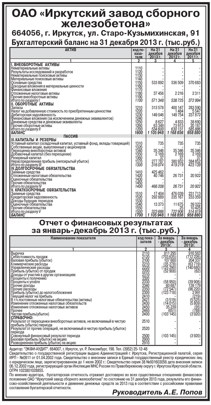 ОАО «Иркутский завод сборного железобетона». Бухгалтерский баланс на 31 декабря 2013г. (тыс.руб.)