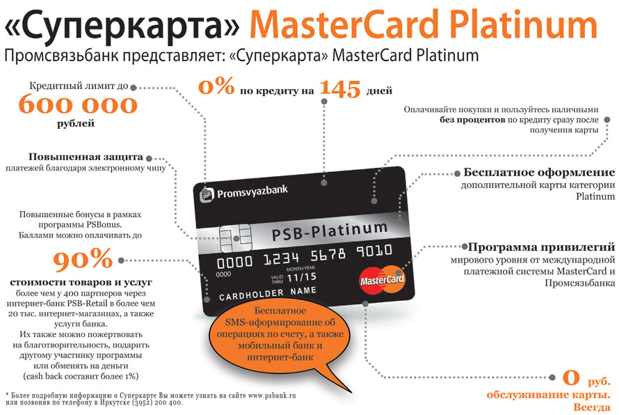 В «Суперкарту» включен также дополнительный набор сервисных услуг – тоже бесплатных: это смс-оповещение, интернет-банк. Льготный период по карте максимально длинный – 145 дней, в течение него можно пользоваться средствами по карте и не платить проценты.