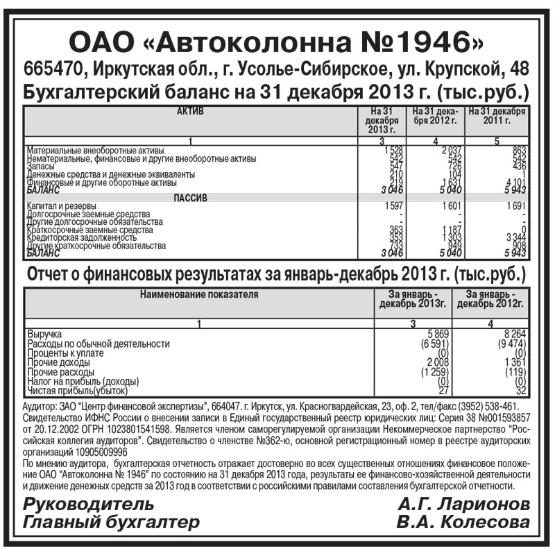 ОАО «Автоколонна №1946». Бухгалтерский баланс на 31 декабря 2013г. (тыс.руб.)