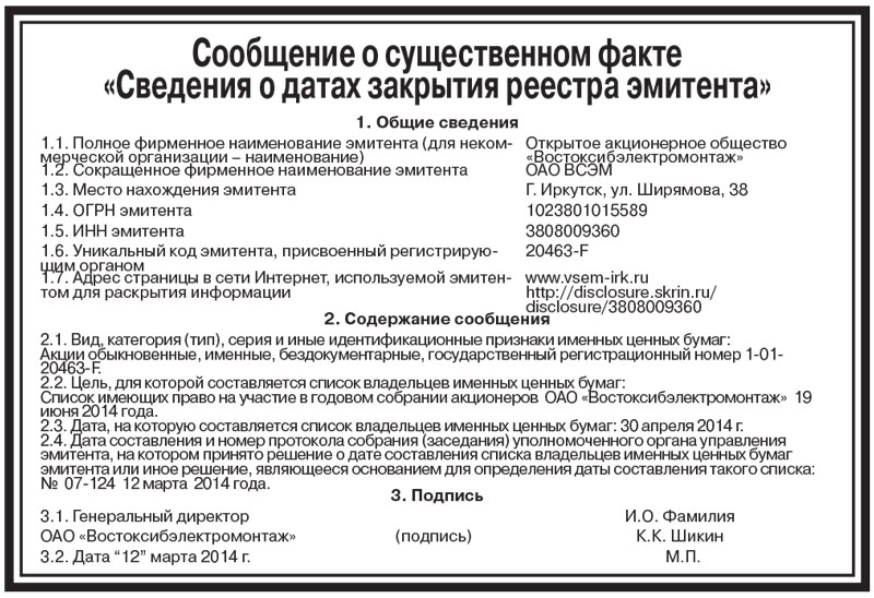 Сообщение о существенном факте «Сведения о датах закрытия реестра эмитента». Открытое акционерное общество «Востоксибэлектромонтаж»
