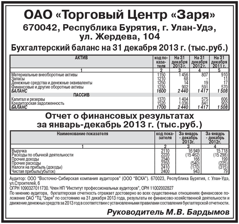 ОАО «Торговый Центр «Заря». Бухгалтерский баланс на 31 декабря 2013г. (тыс.руб.)