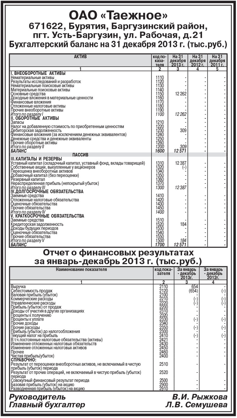 ОАО «Таежное». Бухгалтерский баланс на 31 декабря 2013г. (тыс.руб.)