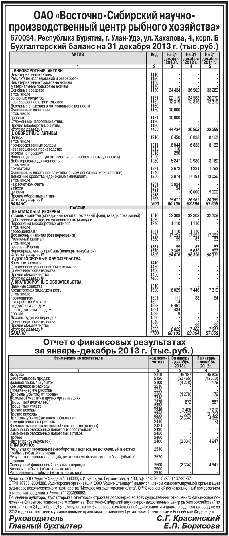 ОАО «Восточно-Сибирский научно-производственный центр рыбного хозяйства». Бухгалтерский баланс на 31 декабря 2013г. (тыс.руб.)