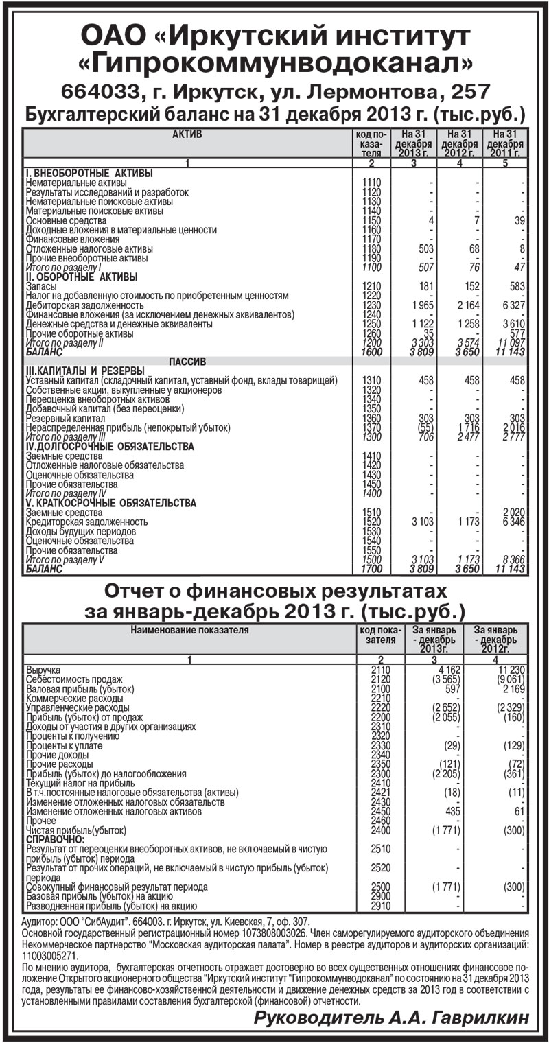 ОАО «Иркутский институт «Гипрокоммунводоканал». Бухгалтерский баланс на 31 декабря 2013г. (тыс.руб.)