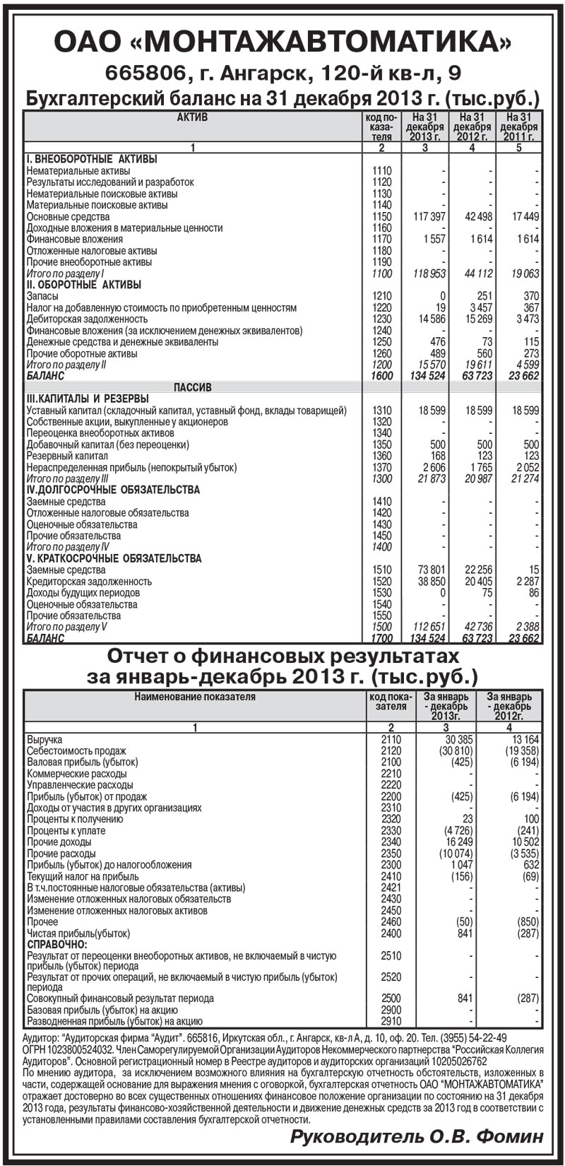 ОАО «МОНТАЖАВТОМАТИКА». Бухгалтерский баланс на 31 декабря 2013г. (тыс.руб.)