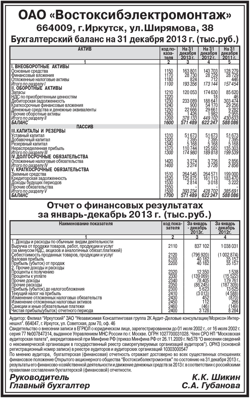 ОАО «Востоксибэлектромонтаж». Бухгалтерский баланс на 31 декабря 2013г. (тыс.руб.)