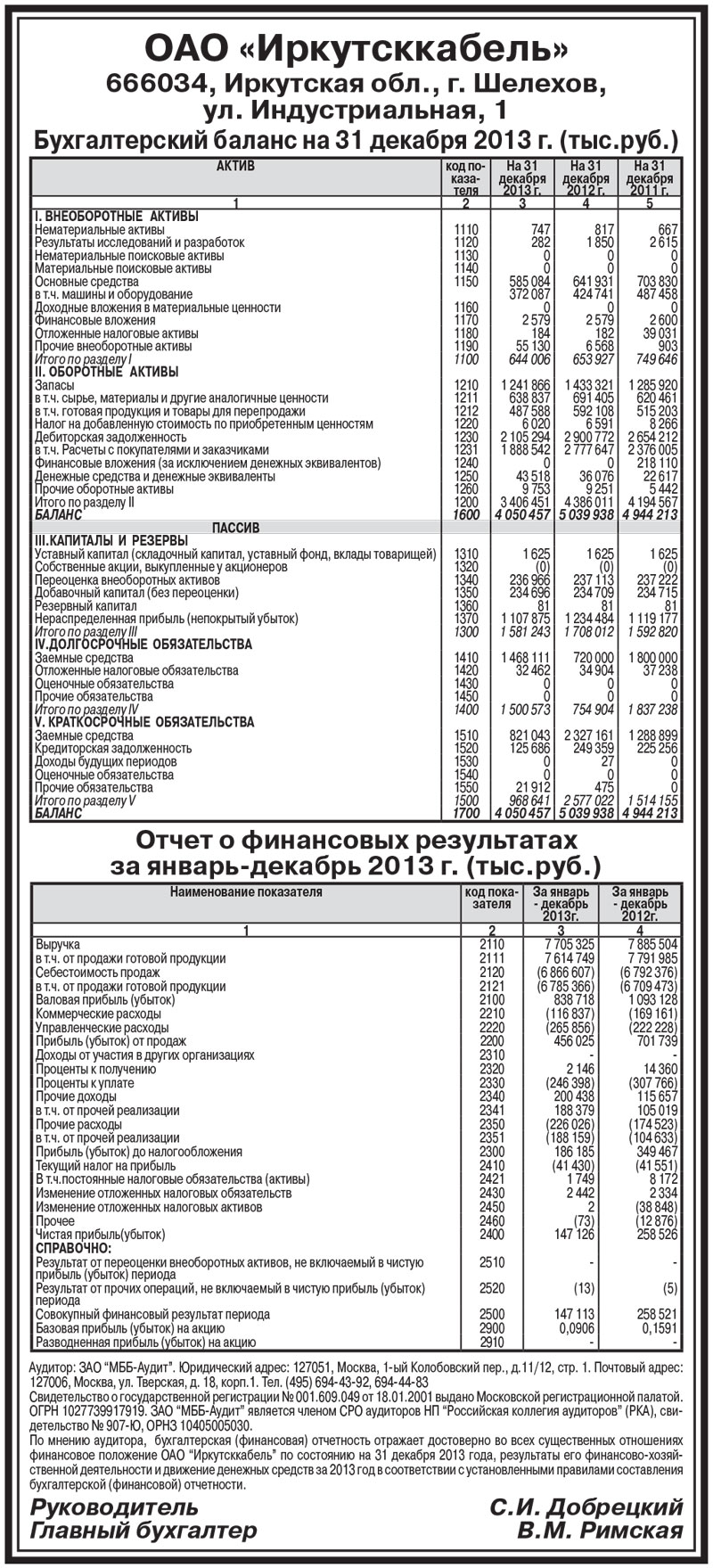 ОАО «Иркутсккабель». Бухгалтерский баланс на 31 декабря 2013г. (тыс.руб.)