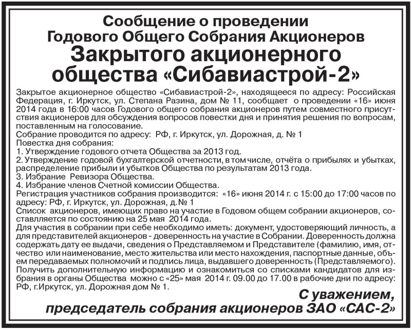 Сообщение о проведении Годового Общего Собрания Акционеров Закрытого акционерного общества «Сибавиастрой-2»