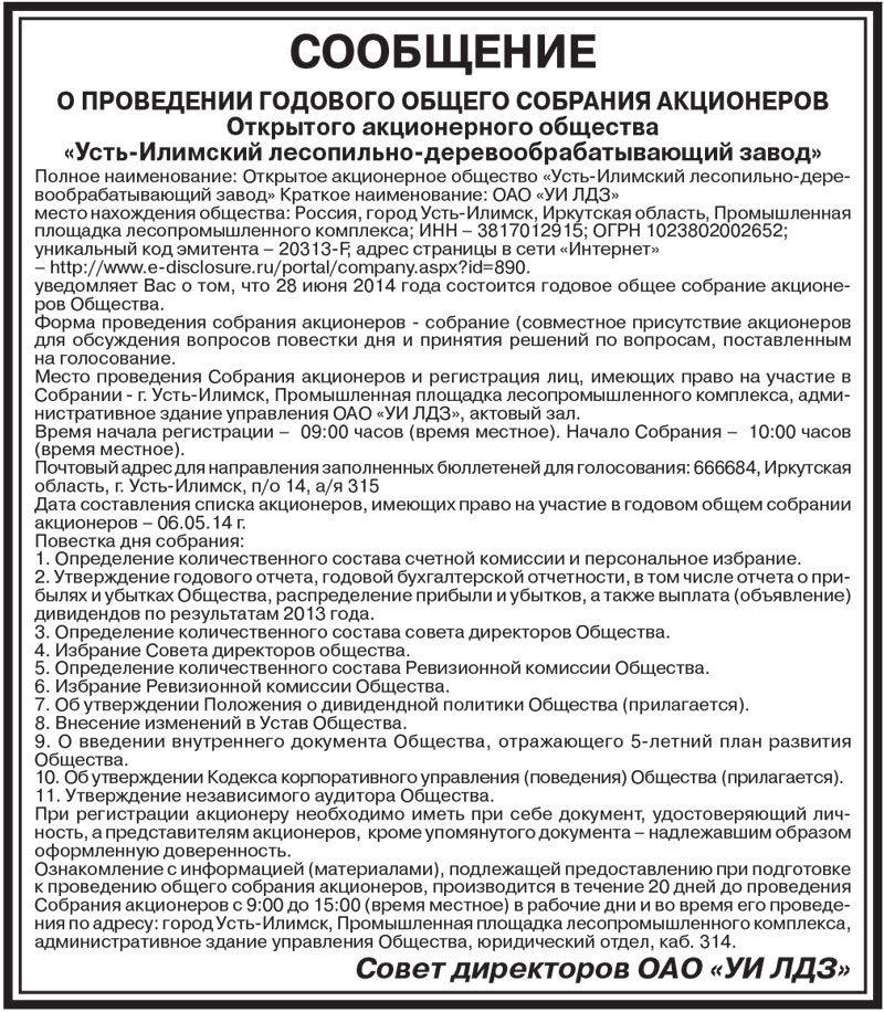 СООБЩЕНИЕ О ПРОВЕДЕНИИ ГОДОВОГО ОБЩЕГО СОБРАНИЯ АКЦИОНЕРОВ Открытого акционерного общества «Усть-Илимский лесопильно-деревообрабатывающий завод»