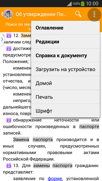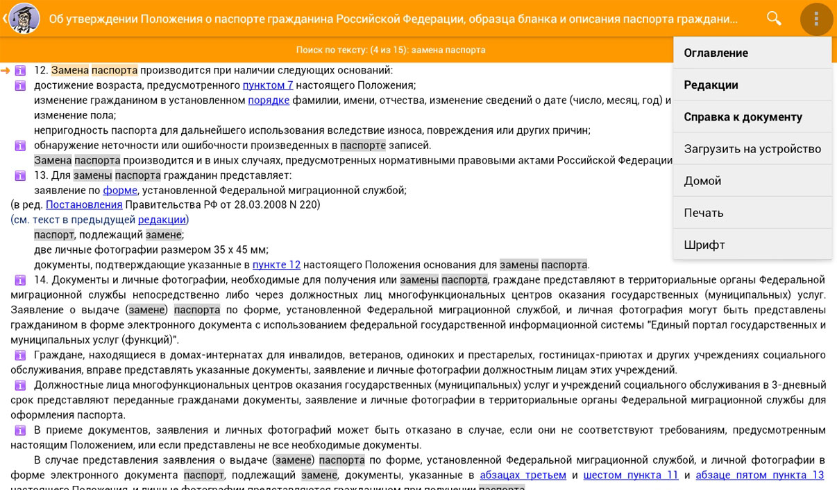 Теперь вся информация о документе и основные возможности работы с ним («Справка», «Оглавление», «Редакции», «Загрузить на устройство» и пр.) перенесены в меню на верхней панели. Еще одно важное изменение – список кодексов в разделе «Популярное» доступен без подключения к Интернету.
