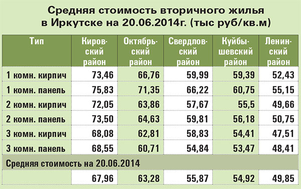 Средняя стоимость вторичного жилья в Иркутске на 20.06.2014г. (тыс руб/кв.м). По данным REALTY.IRK.RU