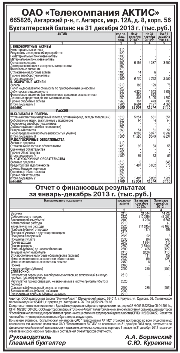 ОАО «Телекомпания АКТИС». Бухгалтерский баланс на 31 декабря 2013 г. (тыс.руб.)