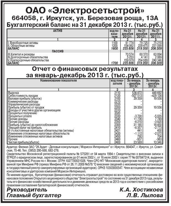 ОАО «Электросетьстрой». Бухгалтерский баланс на 31 декабря 2013 г. (тыс.руб.)