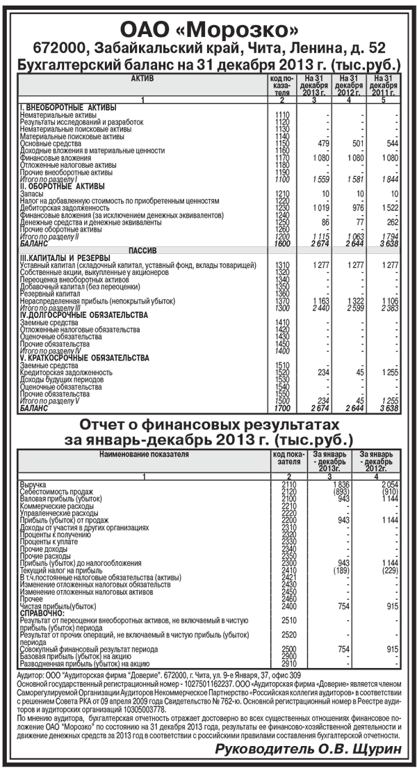 ОАО «Морозко». Бухгалтерский баланс на 31 декабря 2013 г. (тыс.руб.)