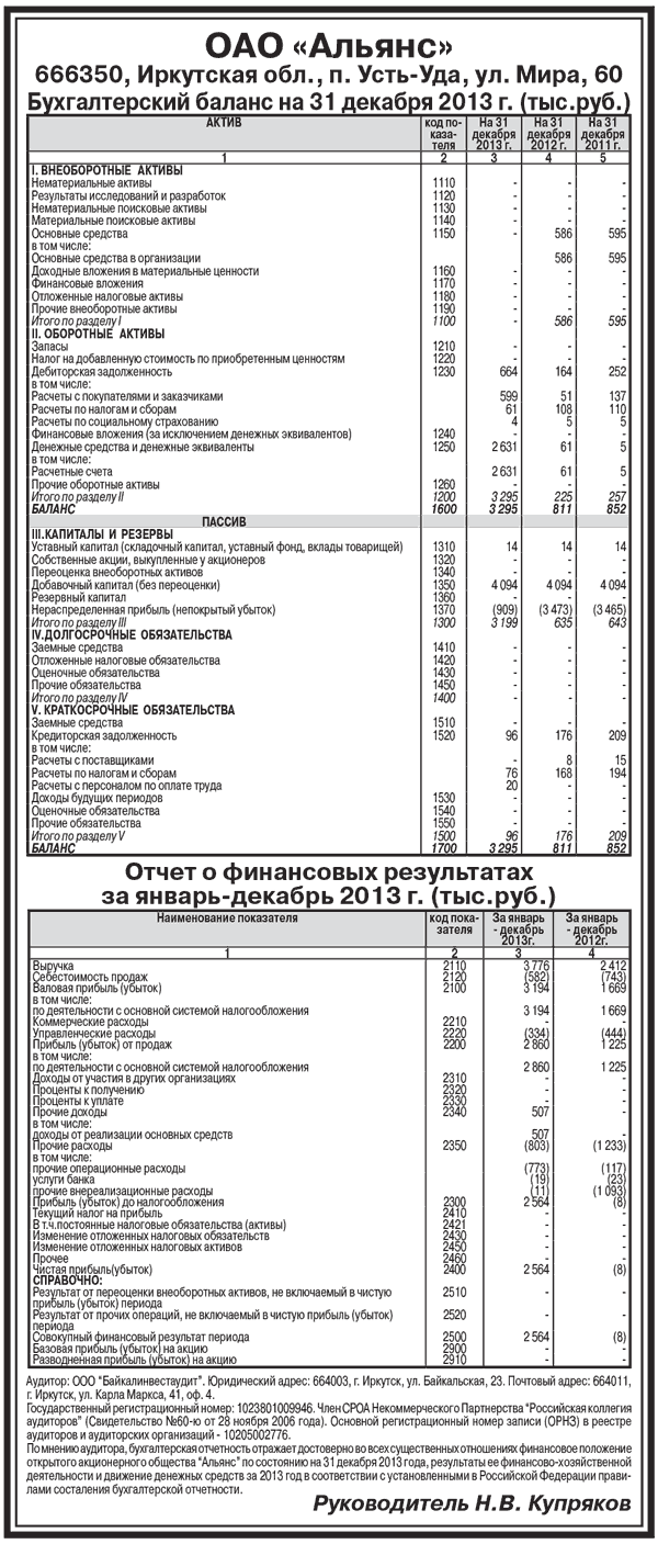 ОАО «Альянс». Бухгалтерский баланс на 31 декабря 2013 г. (тыс.руб.)